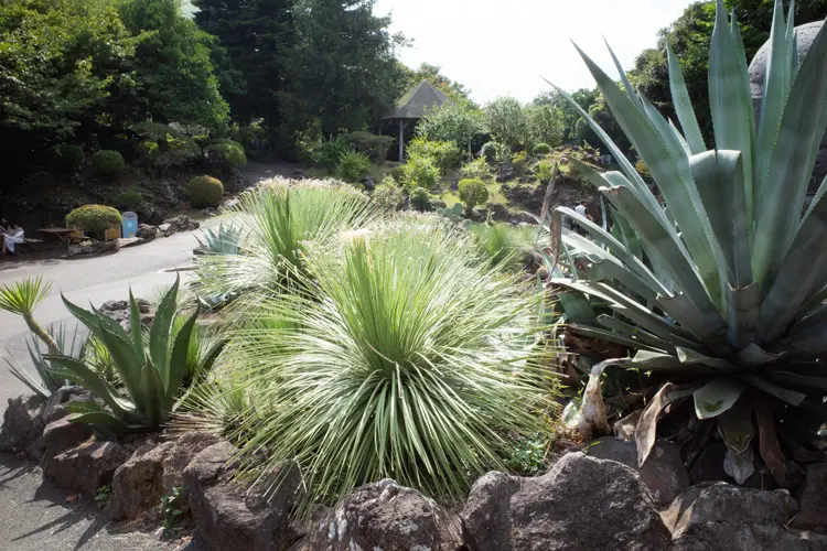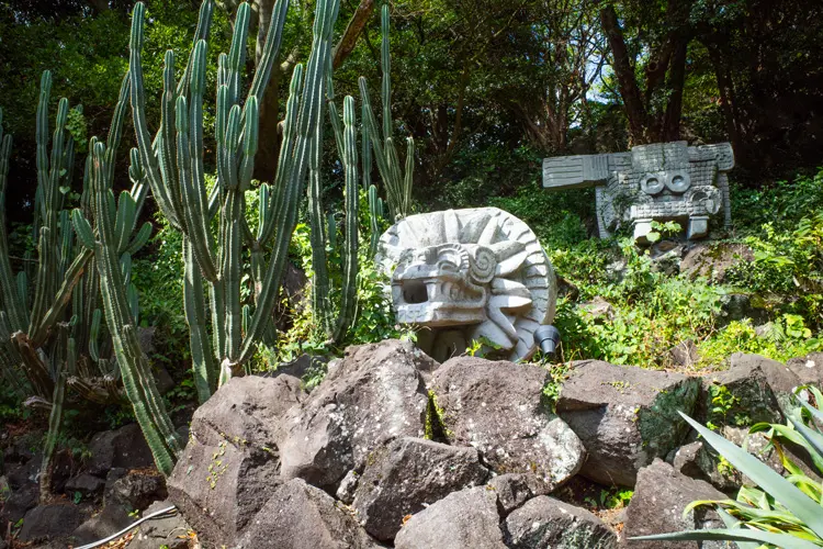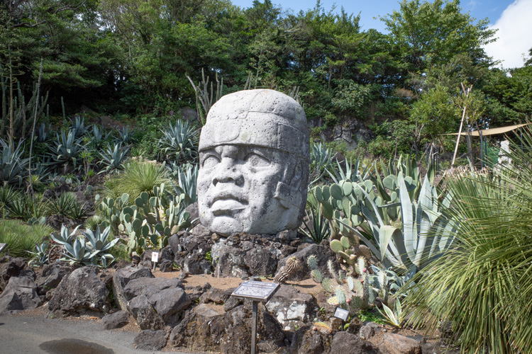 入園するとすぐに広がるのは、大きなサボテンやアガベを中心としたロックガーデン。乾いた岩場にずらりと並ぶ光景は異国の雰囲気が漂っていて、ちょっとした旅行気分になります。随所に現れる石像は古代メキシコ・オルメカ文明をモチーフにしたものらしく、よりいっそう非日常感が増します。