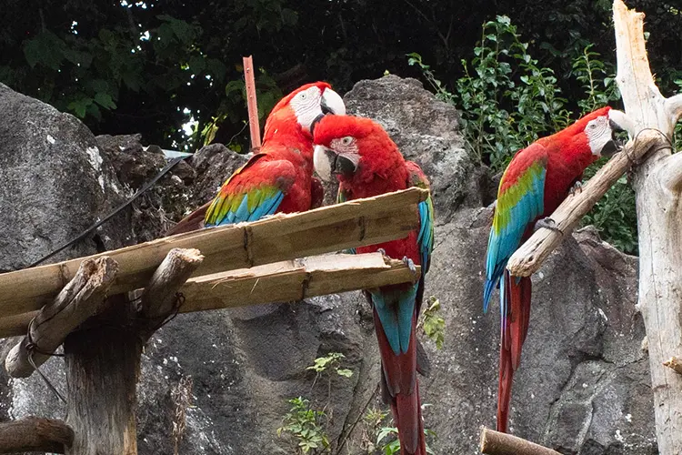 青や赤のコンゴウインコは存在感たっぷりの大型インコ。こちらも放し飼いで木の上で仲間とのんびり過ごしていました。羽の色がとても鮮やかで、鳴き声はとても大きく迫力がありました。