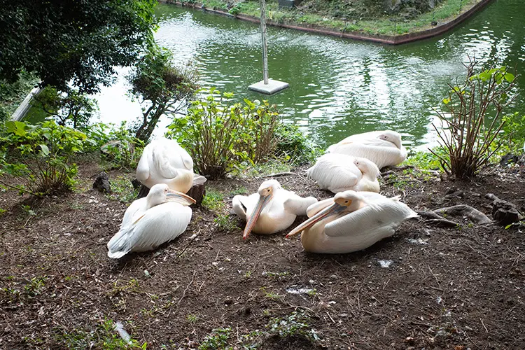 それから池のそばで休んでいるペリカンたち。のんびり過ごしている姿に癒されました。そういえばペリカンって初めて見たかもしれません。大きなくちばしも特徴的ですが、羽もとても綺麗でした。