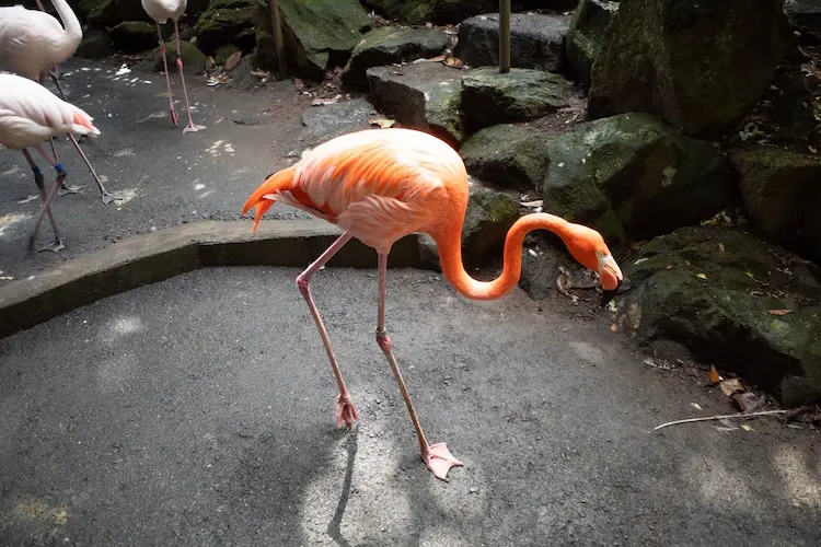 しばらく歩くと今度はフラミンゴの群れと遭遇。人間のことなんて気にせず堂々と歩いていきます。こちらの方がどうしていいか分からず動けなくなってしまい、横切る姿を真近にみました。近くで見る羽根は本当に鮮やかなピンクで、アップで撮ると羽の質感まで分かり、美しかったです。首を伸ばして歩く姿が独特で、存在感がありました。
