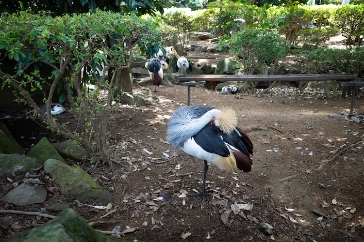 ホオジロカンムリツルは一本足で立って休憩中。体を丸くしていたので、あまりよく見えずちょっと残念でしたが、カラフルでユニークな姿であることはわかりました。次に来たときは動いているところも見てみたいです。