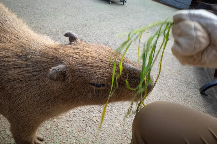 次に向かったのは、カピバラのふれあいコーナー。草のおやつをあげられる体験に挑戦しました。