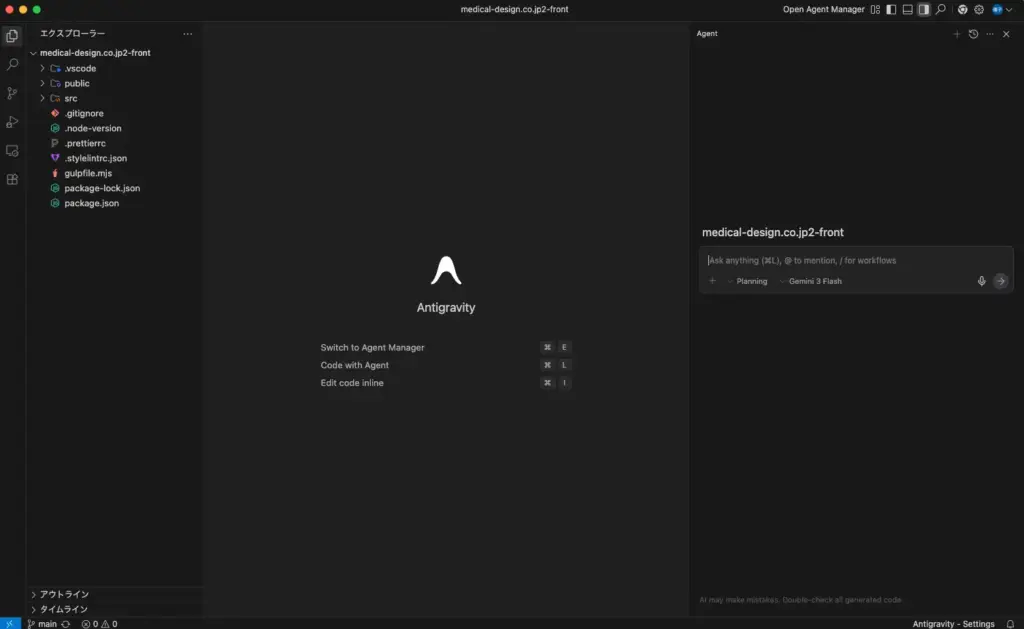 Antigravityの編集画面の見た目や操作感は Visual Studio Code とほぼ同じです。