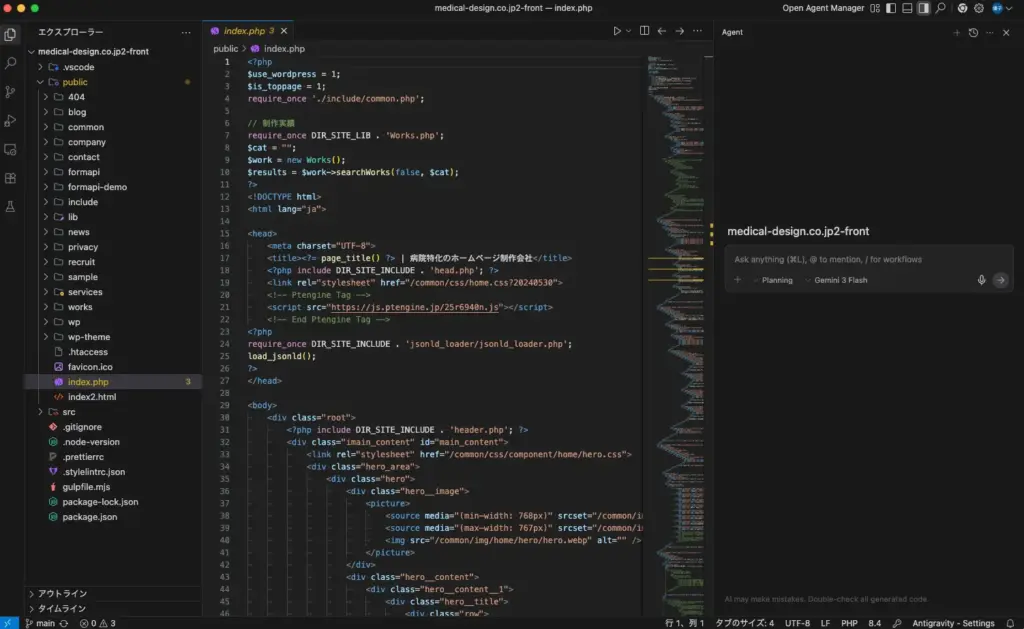 AIツールといえば、ChatGTPについては今年から使い始めており、HTMLコードの修正したい部分を書き換えてもらったり、簡単なレイアウト修正でCSSを書いてもらったり、画像の文字起こしや、既存のHTML構造やテンプレートに原稿を入れ込むなど、業務補助として活用していました。ChatGPTでも十分効率化ができているのですが、「Antigravity」はそれ以上の複雑なタスクを自律的にこなすので、とても驚いています。