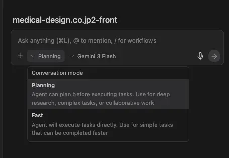- Planningモード:タスクを実行する前に計画を立て、十分な調査・思考・計画をおこなう。複雑なタスクに向いている