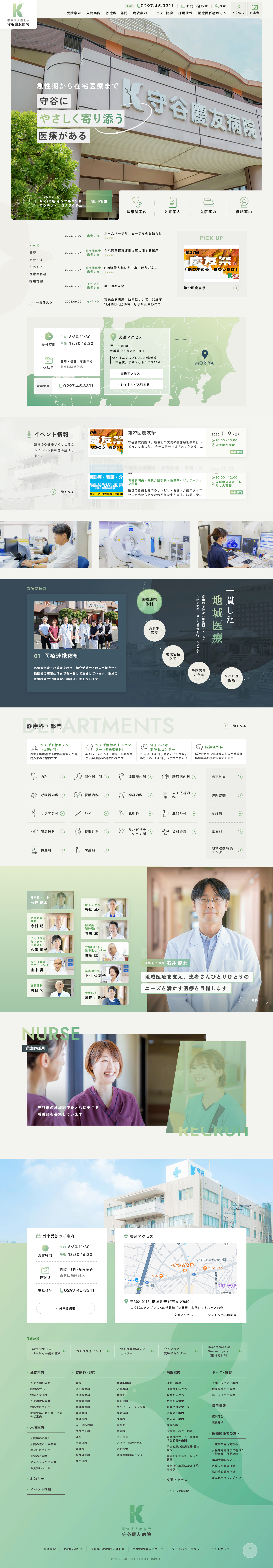 | 説明 | 地域を包括する医療体制を特徴とする貴院の独自性が表現できるよう、地域性と公共性をブランドイメージとし、老若男女を問わずすべての地域住民の方々に親しまれるデザインを目指しました。 景観行政団体となっている守谷市の「緑の街」をイメージした優しい緑色をテーマカラーとして使用し、アクセントとして現在のロゴにも使われている市の鳥である小綬鶏のシルエットを各所に配置することで、より地域性をしっかりと訴求しています。 また、どなたでも読みやすいように可読性を意識し、見出しや本文などの文字も濃く太くはっきりと表記することで、公共性を持ったデザインとなっています。 |